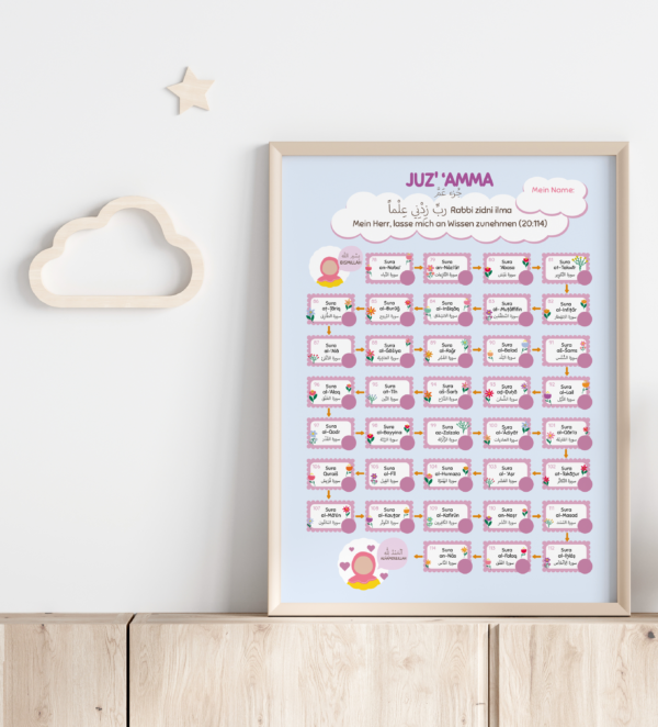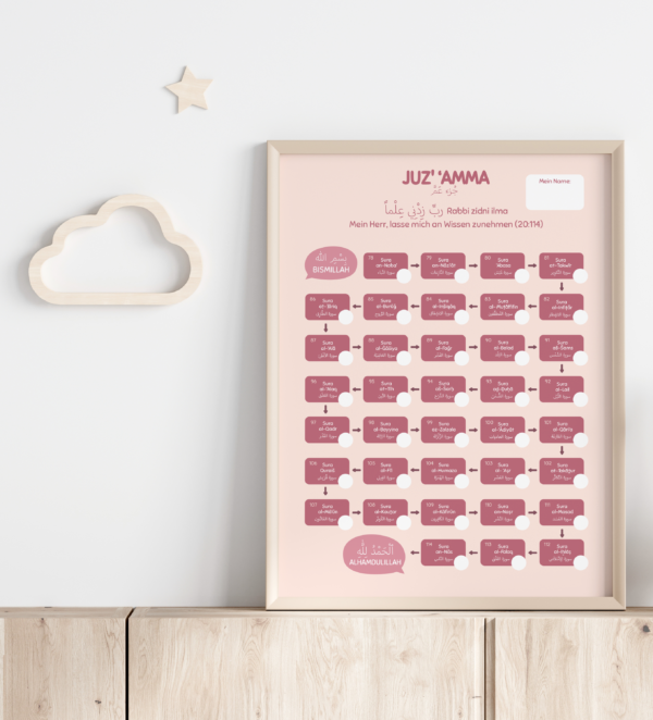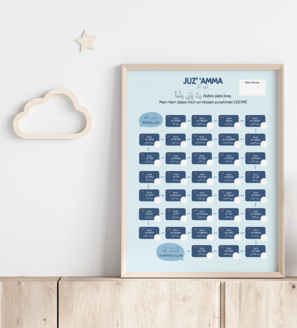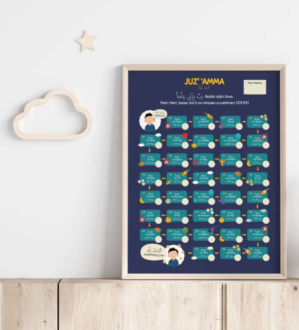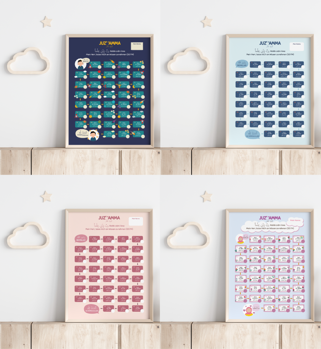Motiviere dein Kind die Suren aus dem Qur’an auswendig zu lernen mit dem Juz Amma Poster Tracker! Für jede gelernte Sure, darf das Kind entweder einen Sticker kleben oder den Kreis bemalen. Fang früh mit deinem Kind an, den Qur’an zu erlernen.