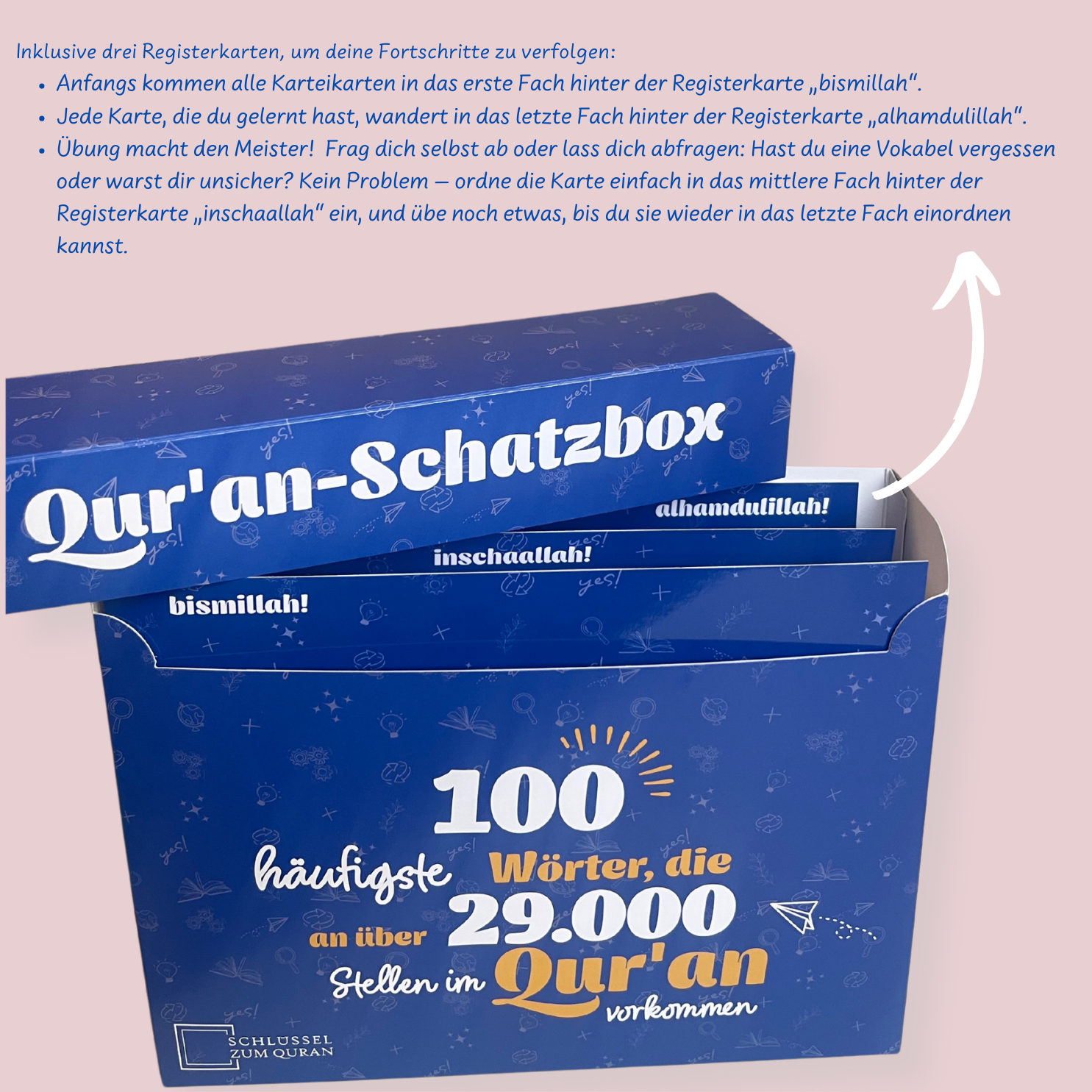 Die Qur’an-Schatzbox ist die perfekte Lösung: Mit ihr lernst du die 100 häufigsten Wörter aus dem Koran, die an über 29.000 Stellen vorkommen. So erschließt du dir Schritt für Schritt den Qur’an – schnell, klar und nachhaltig.
